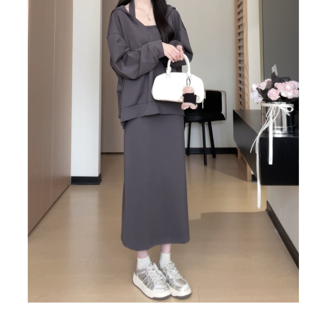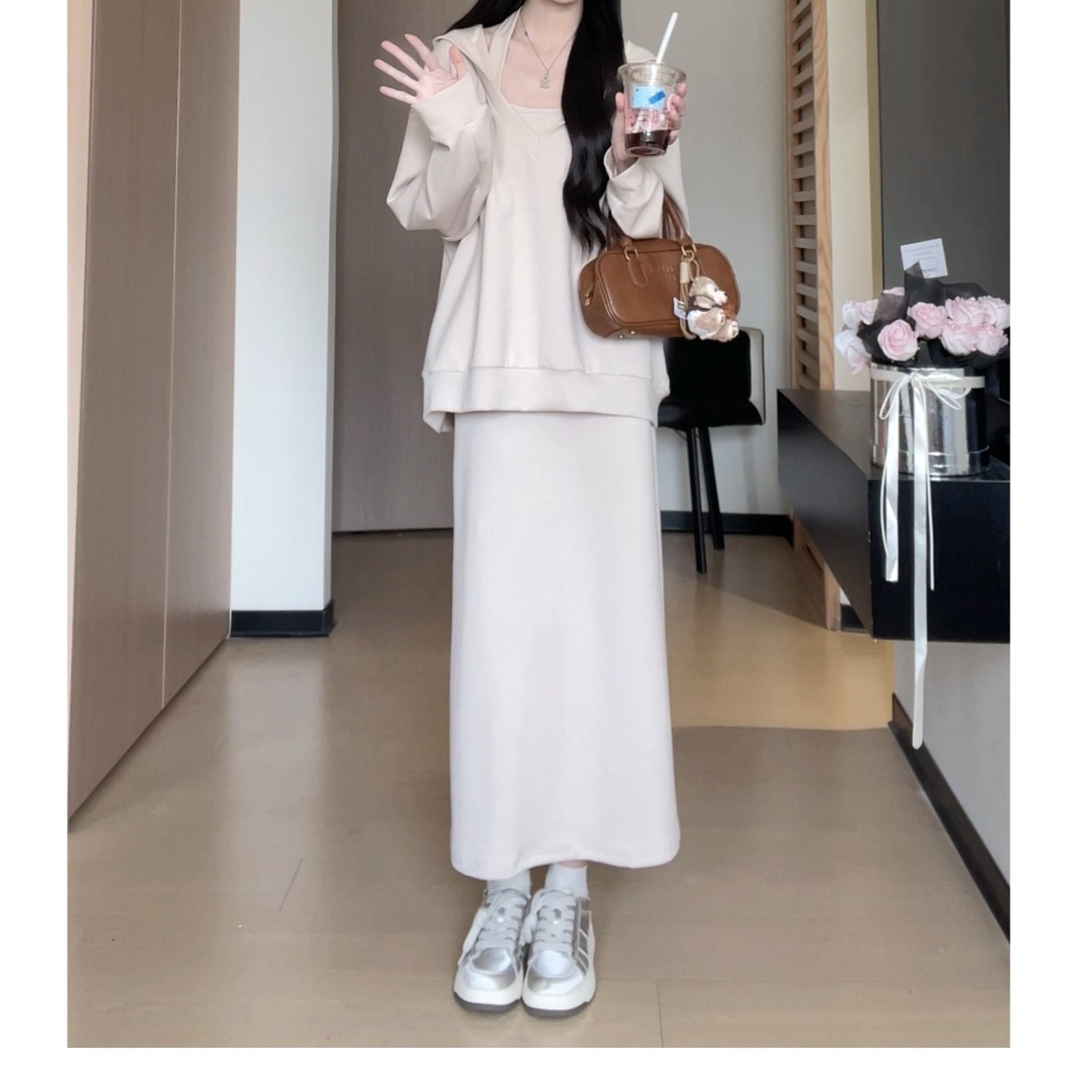 淺米色連帽衛衣搭配同色系長裙 柔軟材質貼合膚感 日常出門穿著舒適又顯得溫和大氣 舒適又好看